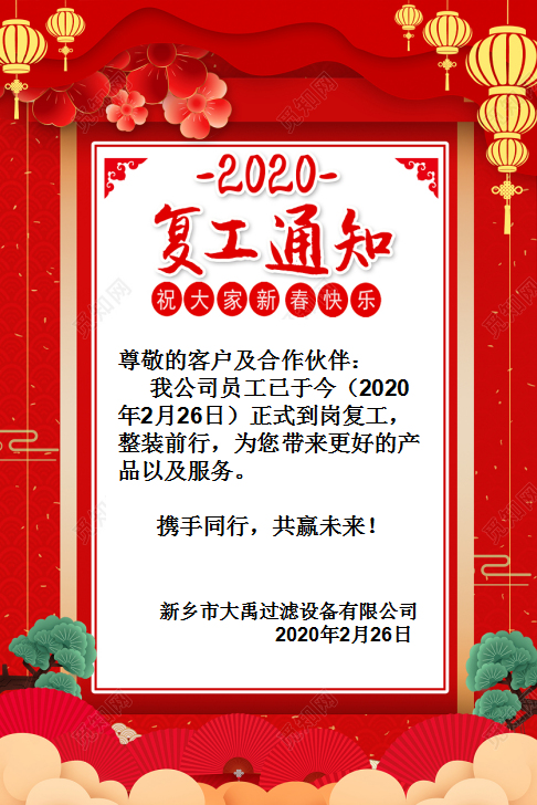 2020新鄉市大禹過濾設備有限公司復工通知