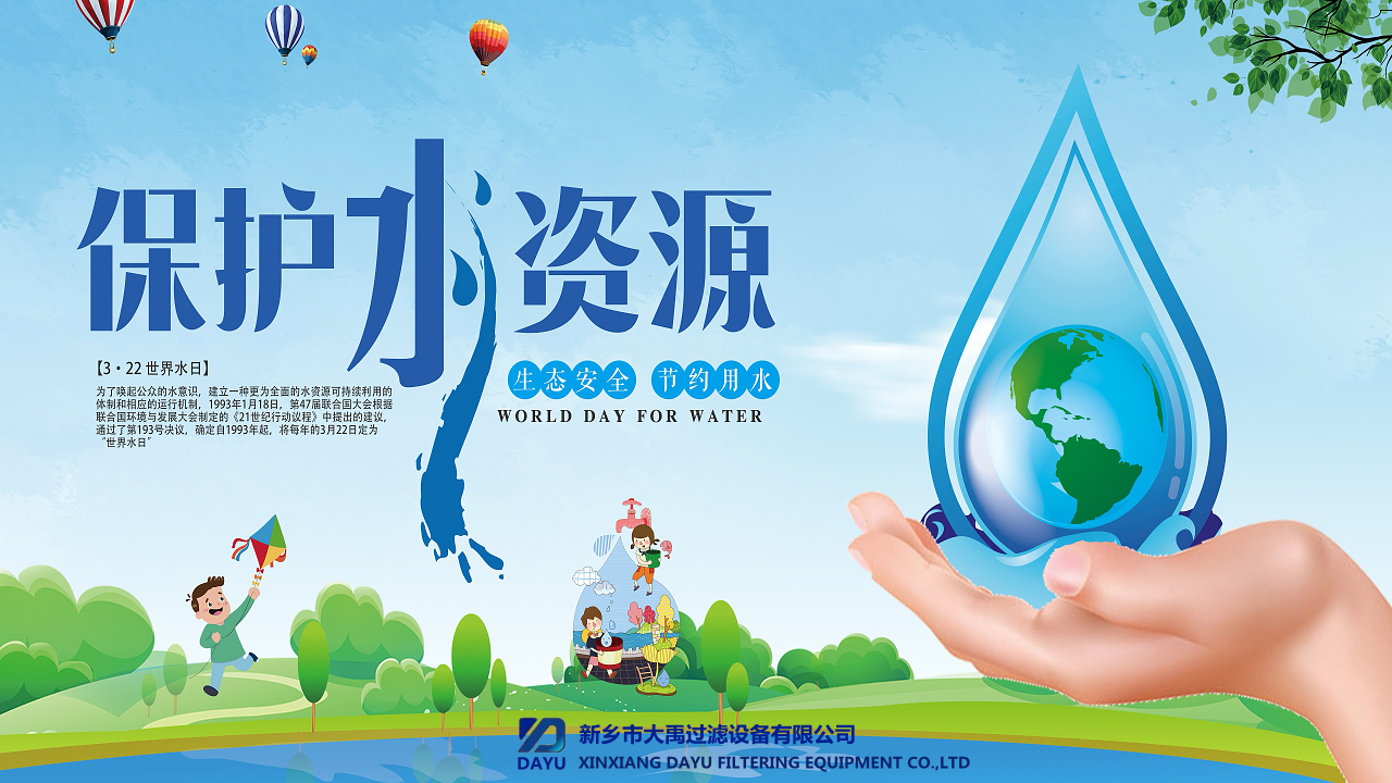新鄉市大禹過濾設備有限公司全體員工將銘記:水資源是人類生命不可或缺的組成部分。我們每個人都有責任保護和節約水資源。雖然我們面臨各種挑戰和問題,但是只要我們共同努力,世界水日的目標就會實現。讓我們行動起來,為保護水資源、打造美好地球而努力!